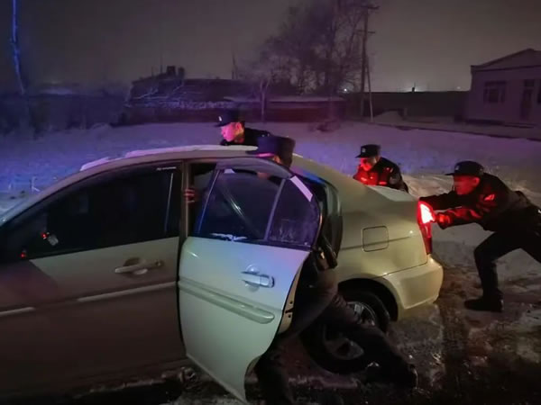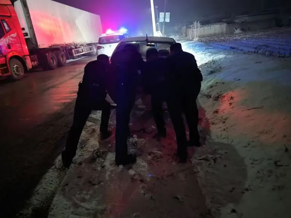 3月26日20時許,肇東市公安局昌五鎮派出所正在值班的“春苗”新警接到群眾求助電話:有轎車行駛在昌五鎮境內路段被困請求救助。接到電話后“春苗”新警迅速趕往事發地。到現場后,民警看見多輛汽車被困在雪地和坑內,路面結冰打滑,通過觀察現場環境后,利用攜帶的鐵鍬、拖車繩等救援物資迅速開展工作,經過1個多小時,終于安全將被困車輛推至安全區域。