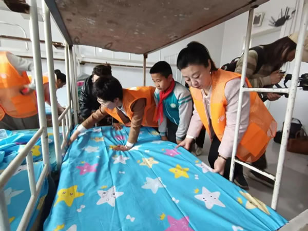 劉鐵波一行先后深入學生宿舍、食堂和教室進行實地查看。他詳細聽取學校負責人生源及教師隊伍建設等情況的匯報,仔細詢問孩子們的生活起居安排、食堂飲食衛生情況、教學設施及學習情況,同時對婦聯愛心媽媽伴讀表示肯定。